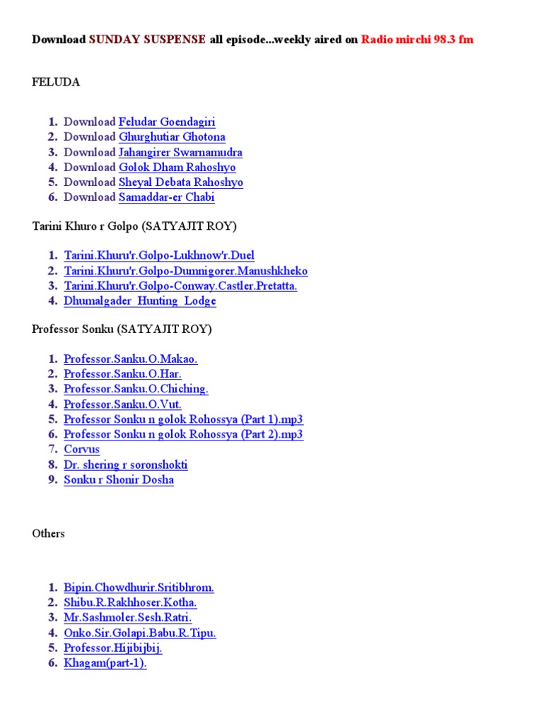 Sunday Suspense Online Sadashib Er Hoi Hoi Kando Sharadindu Bandyopadhyay Mirchi Bangla Sunday Suspense Online - Sunday suspense by radio mirchi aired on radio sunday suspense download.